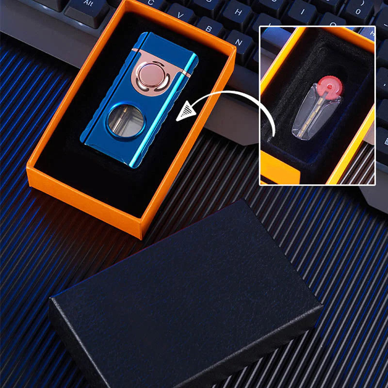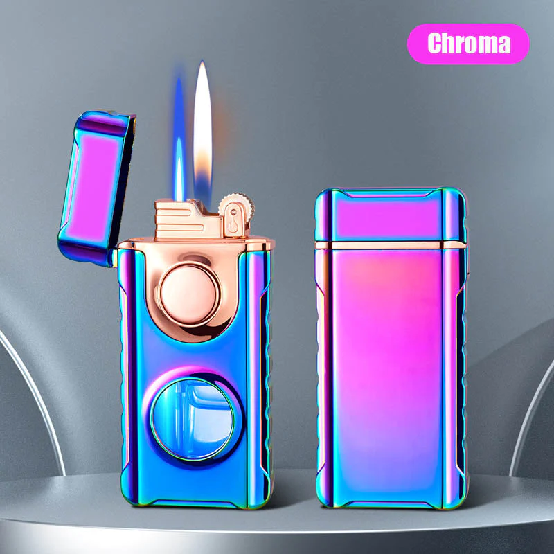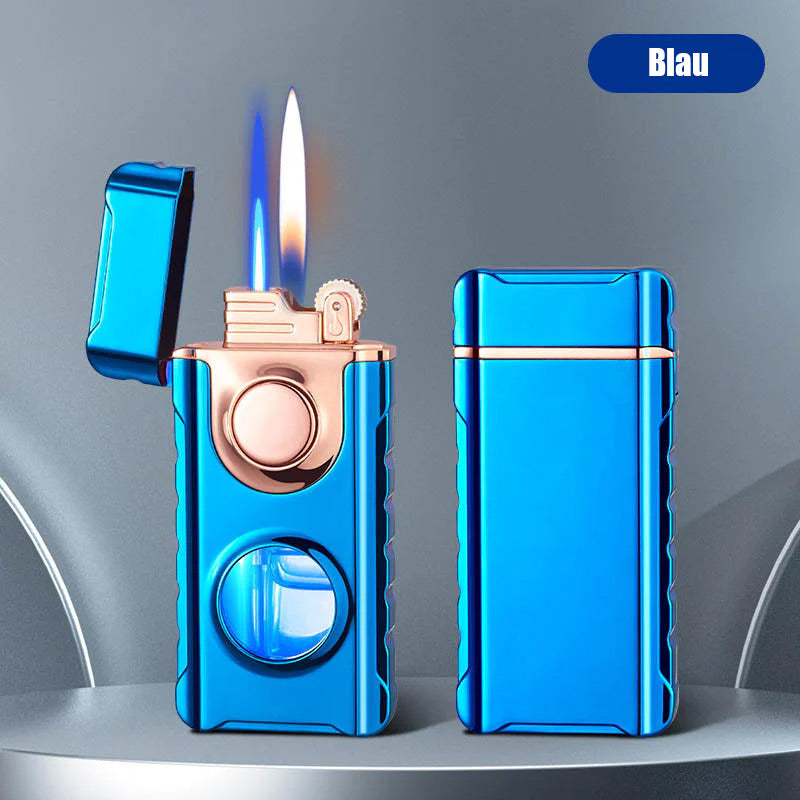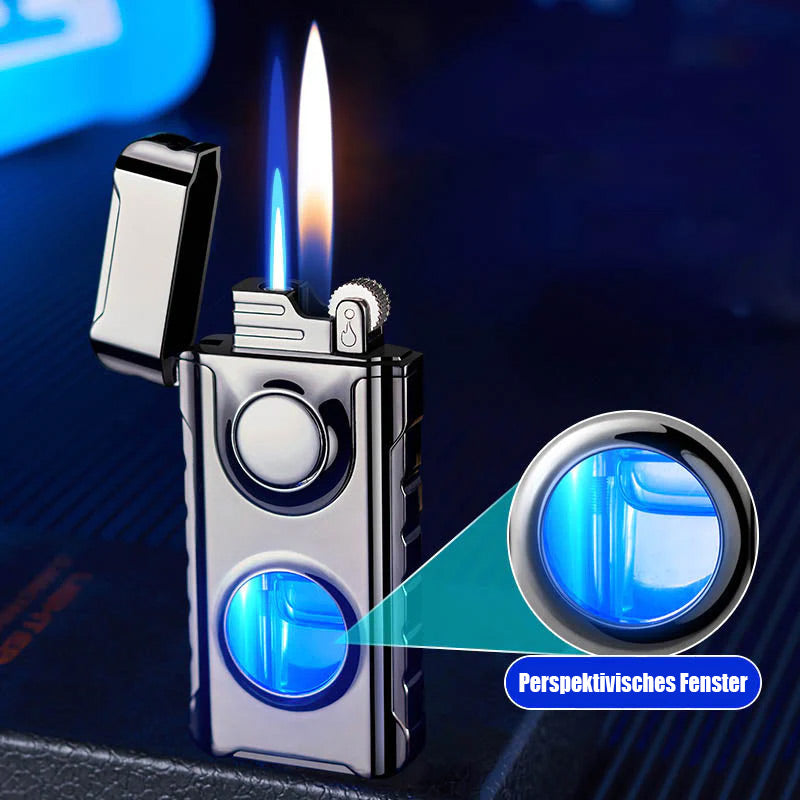 Doppelflammen – Mit einem Feuerzeug sind zwei Anzündarten möglich. Sie können mit dem seitlichen Schalter eine offene Flamme anzünden und dann den oberen Schalter drücken, um eine blaue Flamme zu entzünden. Sie können Ihren Lieblingsmodus wählen.
