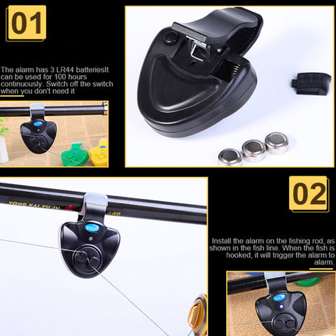 Betrieben mit 3 LR44-Batterien, befestigen Sie den Alarm an der Angelrute, wickeln Sie die Angelschnur um den Auslöser, dann können Sie sich entspannt hinsetzen und auf den Alarm warten.
