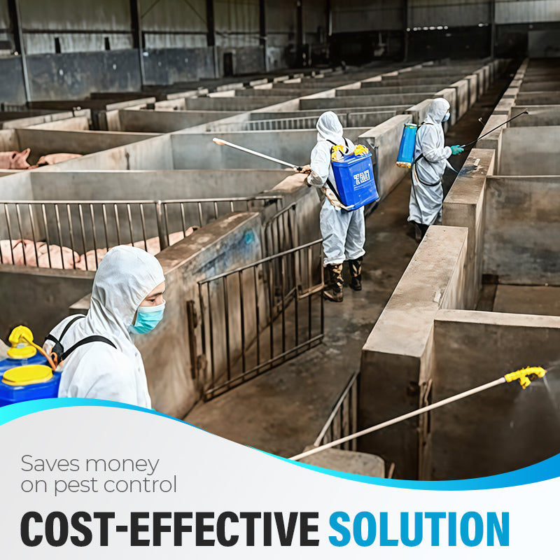KOSTENEFFIZIENTE UND LANGLEBIGE FORMEL: Eine Flasche kann in 25–50 kg Arbeitslösung verdünnt werden und bietet somit hervorragende Haltbarkeit und Wert. Senkt die Gesamtkosten pro Anwendung, besonders vorteilhaft für großflächige oder routinemäßige Behandlungen in Häusern, auf Bauernhöfen oder in Dienstleistungsbetrieben.