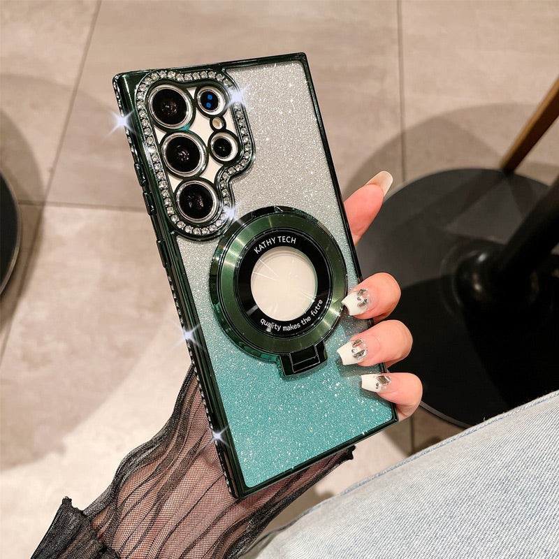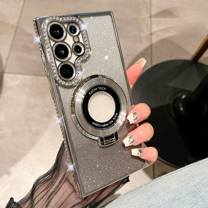 SLIM UND STYLISH: Samsung galvanisiertes, blinkendes Vier-Ecken-Magnetschutzgehäuse mit unsichtbarer Halterung. Elegant, leicht und bietet angemessenen Schutz ohne Sperrigkeit. Mit glitzerndem Glitzerpapier auf der Rückseite, das einen eleganten Eindruck hinterlässt. Bietet einen bequemen Griff und präzisen Zugang zu den Anschlüssen.